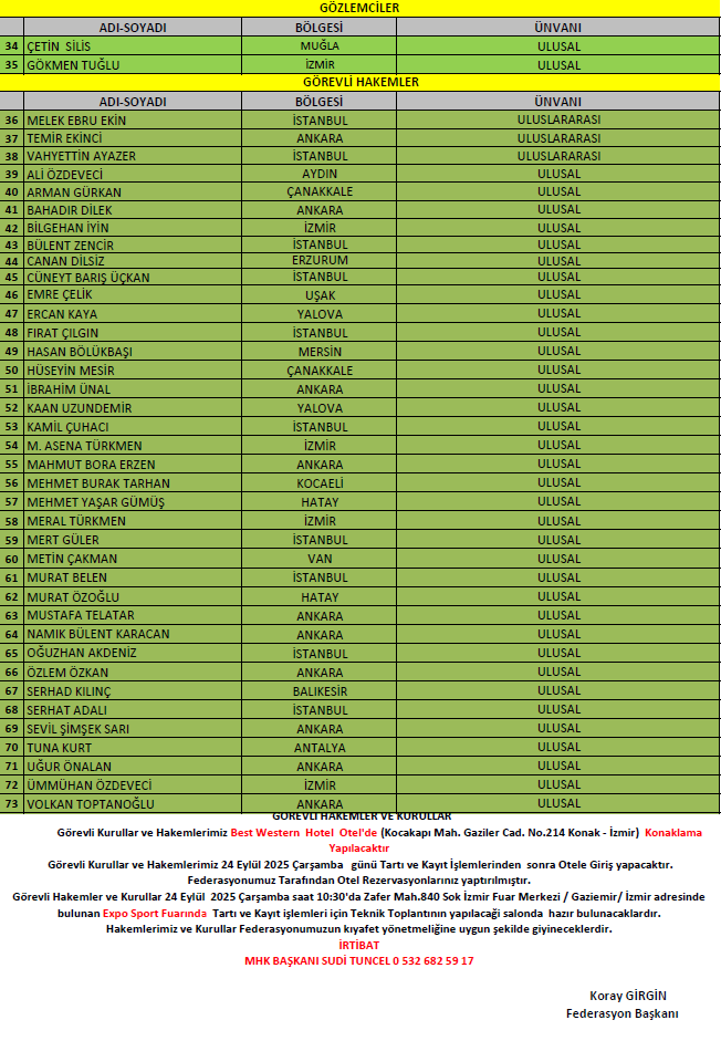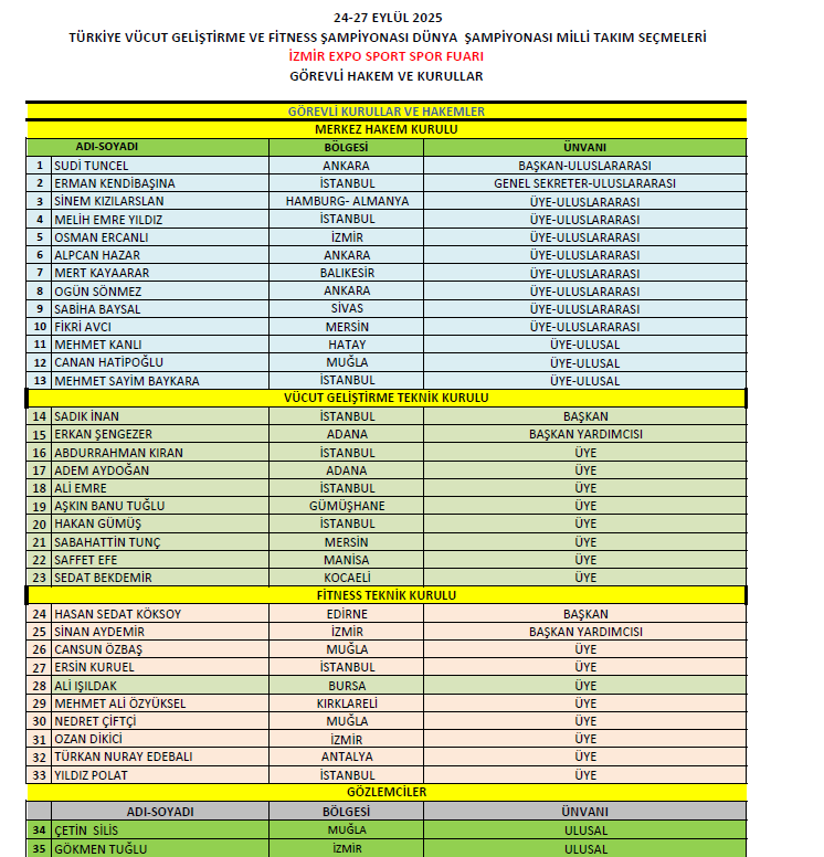 24-27 EYLÜL 2025 TÜRKİYE VÜCUT GELİŞTİRME VE FİTNESS ŞAMPİYONASI DÜNYA ŞAMPİYONASI MİLLİ TAKIM SEÇMELERİİZMİR EXPO SPORT SPOR FUARI GÖREVLİ HAKEM VE KURULLAR LİSTESİ GÜNCELLENMİŞTİR.