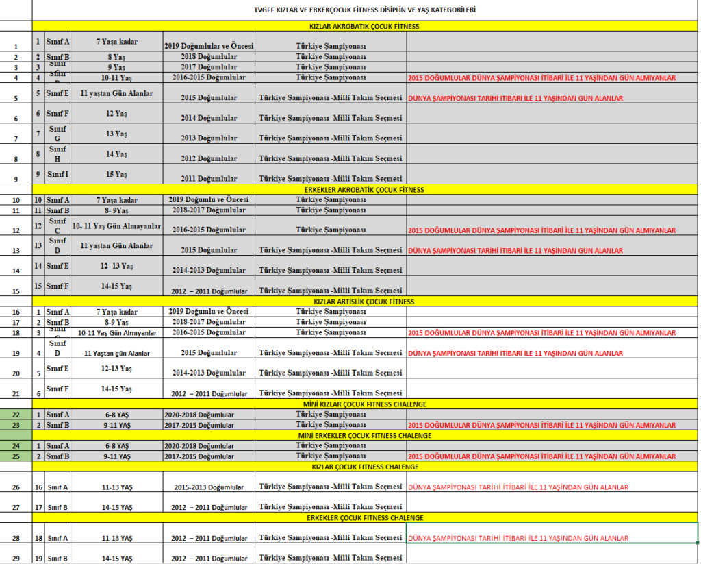2026 yılında uygulanacak kategori ve yaş disiplinleri, ekte yer alan tabloda belirtilmiştir.